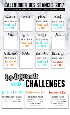 Je vous reviens aujourd'hui avec plusieurs nouvelles ! Le calendrier des week-end à 1000 2017 est enfin disponible, pour que vous puissiez vous organiser sur l'année. J'ai également ajouté quelques petites nouveautés pour cette nouvelle année : 2 nouveaux types de challenge, en lien avec le Week-end à 1000 initial évidemment. Je m'explique ! En plus des séances de Week-end à 1000 trimestrielles, vous pourrez participer au Week-end à lire, trois fois par an, cela se déroulera toujours du vendredi 19h au dimanche 23h59, mais la différence avec le challenge de base, c'est que vous pouvez choisir vous même le nombre de page que vous souhaitez atteindre ! Ce n'est pas la seule nouveauté puisqu'il y aura également la Semaine à lire, qui se déroulera tous les an pendant les fêtes de fin d'année. Une dernière occasion de mettre un grand coup dans la PAL et de réussir vos challenges annuels ! Je vous laisse donc avec ce fameux calendrier.